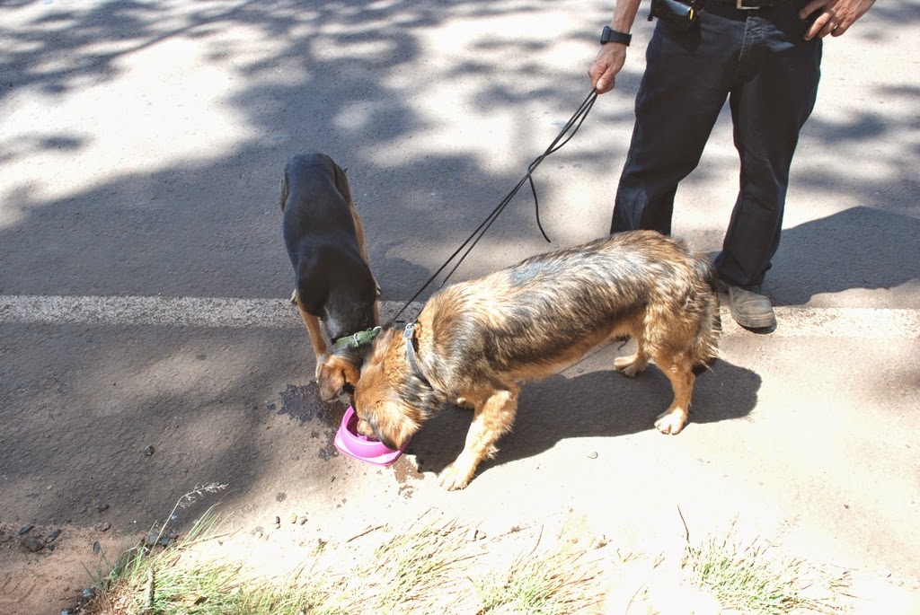 Após beberem água, os cães foram guiados pelo dono para o centro da cidade.