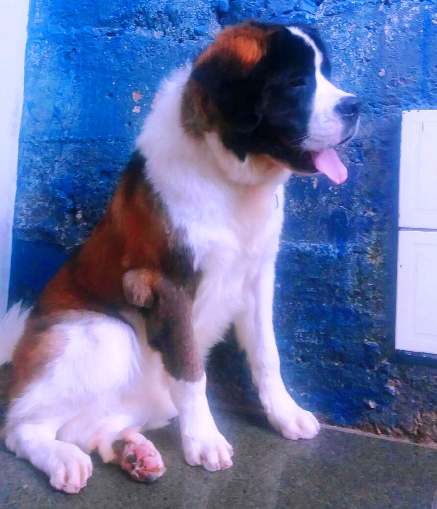 Esta moça grandona é a Carmen. Ela é uma São Bernardo, raça que ficou famosa nos desenhos animados dos anos de 1980 e 1990 nos Estados Unidos, onde aparecia levando chocolate quente para aqueles que se perdiam na neve.