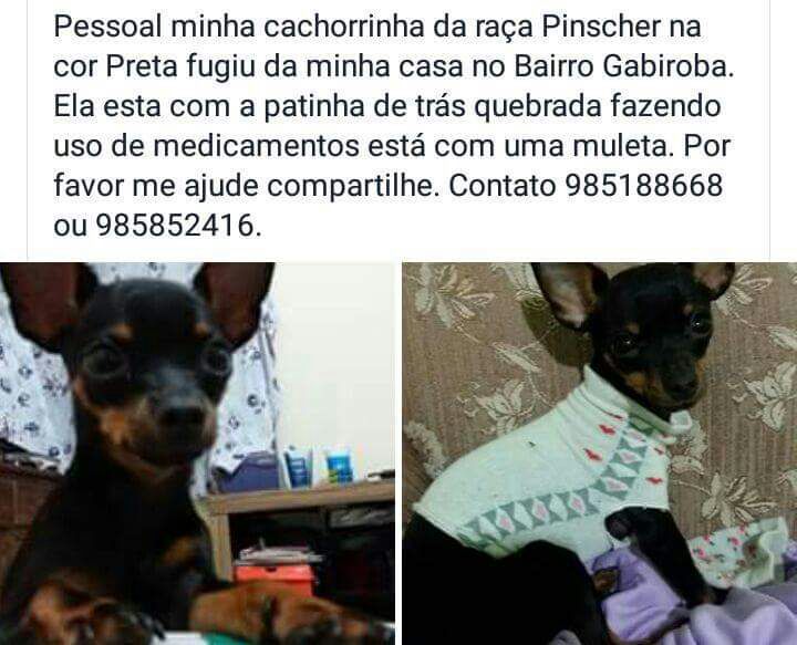 Amigos, a Karina, moradora do bairro Gabiroba, em Itabira, MG, está muito triste com a sumida de sua amiguinha de 4 patas. Sua cadelinha da raça Pinscher sumiu.