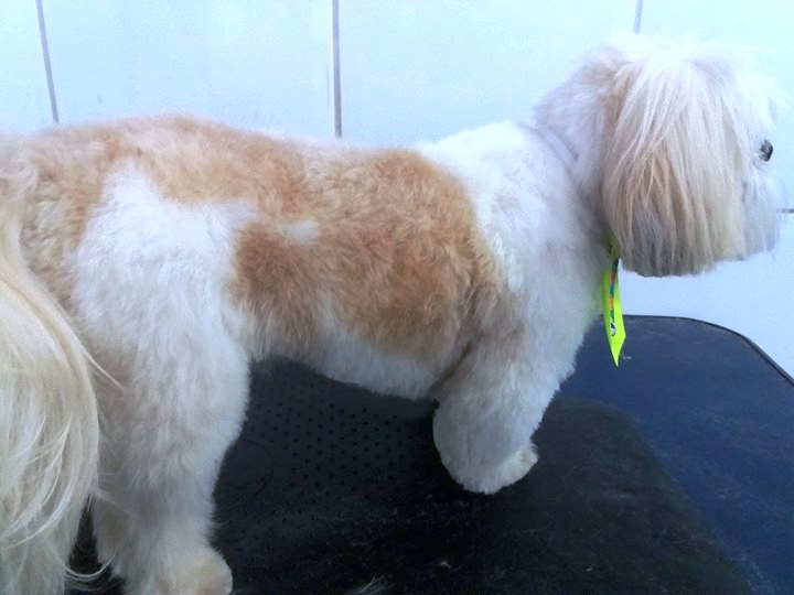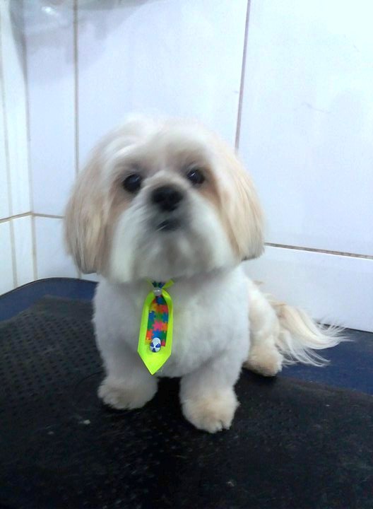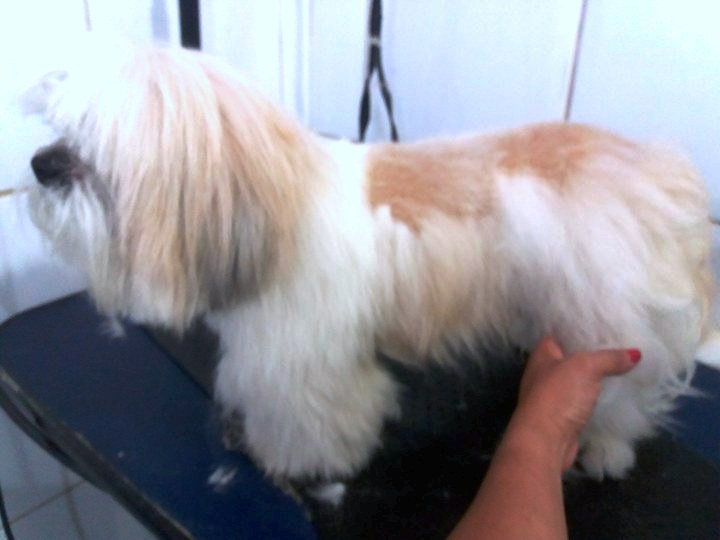 O cãozinho da raça Lhasa Apso este no Departamento de Estética da Clinvet, onde as Groomres realizaram uma tosa e um belo penteado.